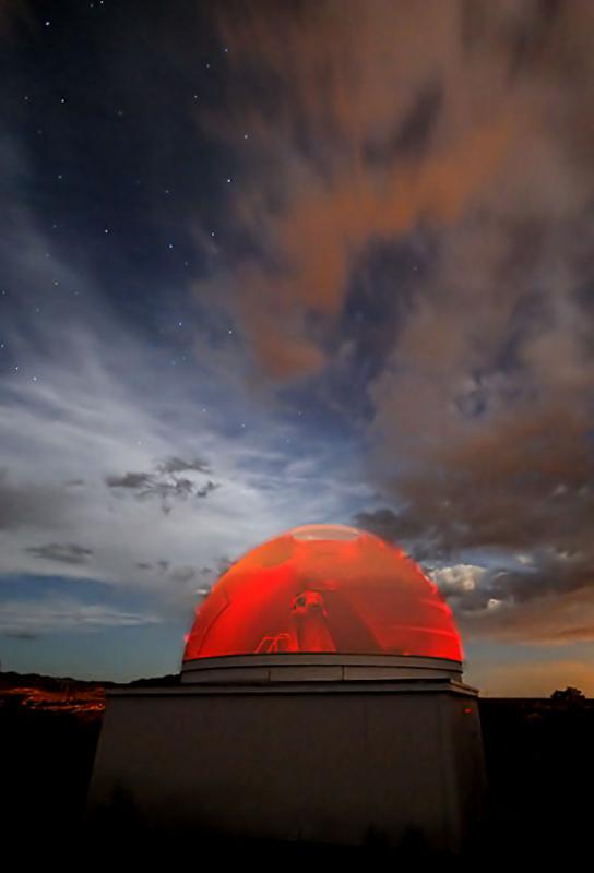Explanation: Why would the dome of a telescopic observatory appear translucent red? As one of the telescopes of the Etscorn Observatory of New Mexico Tech waited to inspect small portions of the night sky, playful observers decided to make this unusual image. Tricks needed to create this seemingly impossible shot included opening the observatory dome slightly, using a red light to illuminate the inside of the dome, spinning the dome, and using a long exposure. The open slit in the dome then allowed the camera to incrementally image the inside of the observatory, including the telescope. A fortuitous break in the clouds allowed the stars of the Big Dipper asterism to shine through.