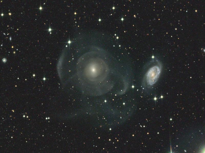 Explanation: What's happening to galaxy NGC 474? The multiple layers of emission appear strangely complex and unexpected given the relatively featureless appearance of the elliptical galaxy in less deep images. The cause of the shells is currently unknown, but possibly tidal tails related to debris left over from absorbing numerous small galaxies in the past billion years. Alternatively the shells may be like ripples in a pond, where the ongoing collision with the spiral galaxy to the right of NGC 474 is causing density waves to ripple though the galactic giant. Regardless of the actual cause, the above image dramatically highlights the increasing consensus that the outer halos of most large galaxies are not really smooth but have complexities induced by frequent interactions with -- and accretions of -- smaller nearby galaxies. The halo of our own Milky Way Galaxy is one example of such unexpected complexity. NGC 474 spans about 250,000 light years and lies about 100 million light years distant toward the constellation of the Fish Pisces.