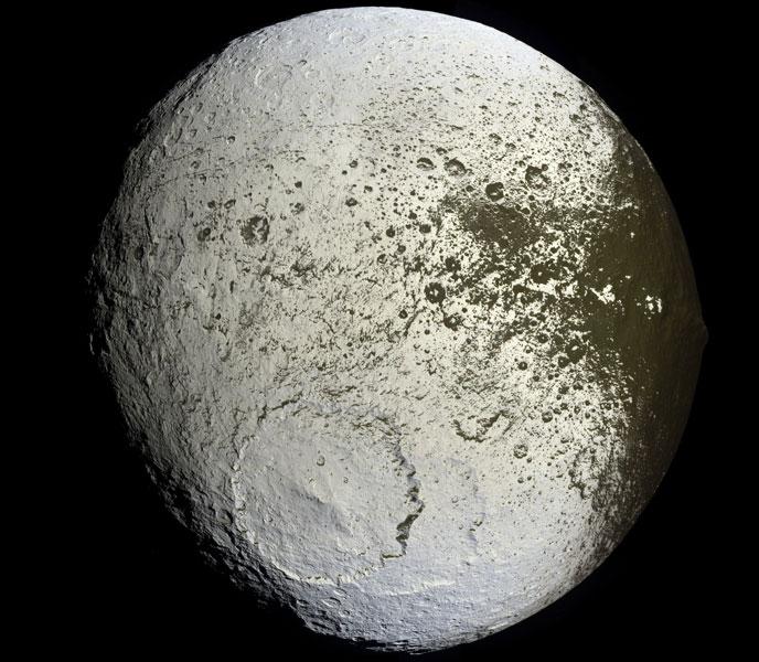 A huge impact crater seen in the south spans a tremendous 450 kilometers