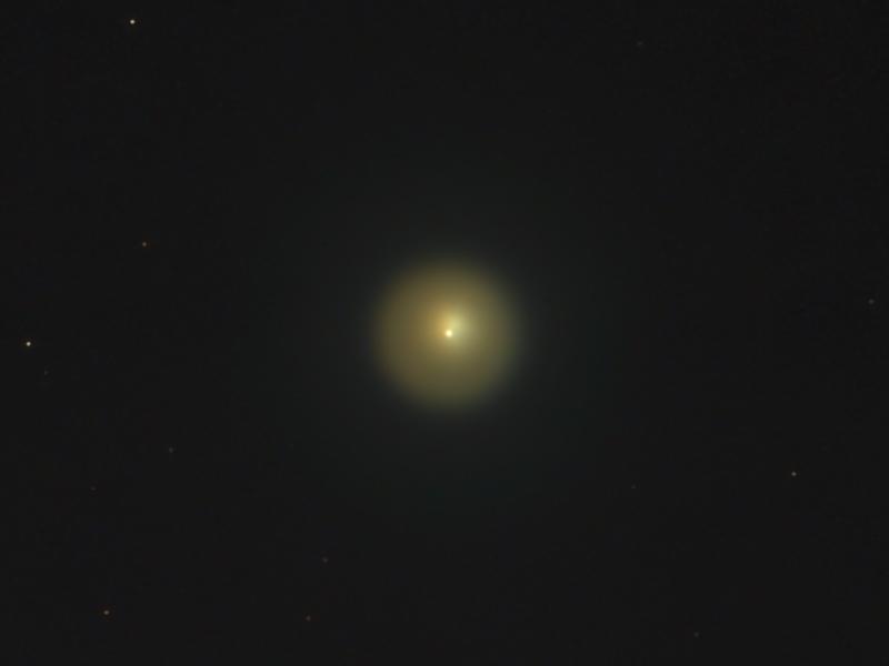 Explanation: What's happened to Comet Holmes? A normally docile comet discovered over 100 years ago, Comet 17P/Holmes suddenly became nearly one million times brighter last week, possibly over just a few hours. In astronomical terms, the comet brightened from magnitude 17, only visible through a good telescope, to magnitude 3, becoming visible with the unaided eye. Comet Holmes had already passed its closest to the Sun in 2007 May outside the orbit of Mars and was heading back out near Jupiter's orbit when the outburst occurred. The comet's sudden brightening is likely due to some sort of sunlight-reflecting outgassing event, possibly related to ice melting over a gas-filled cavern, or possibly even a partial breakup of the comet's nucleus. Pictured above through a small telescope last Thursday, Comet Holmes appeared as a fuzzy yellow spot, significantly larger in angular size than Earth-atmosphere blurred distant stars. Although Comet Holmes' orbit will place it in northern hemisphere skies for the next two years, whether it will best be viewed through a telescope or sunglasses remains unknown.
