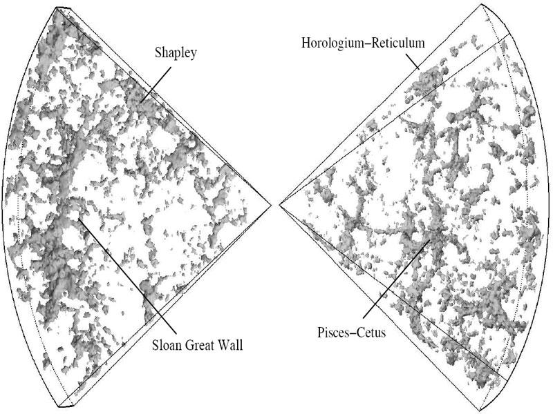 Explanation: What is the largest structure known? The answer might depend on how one defines "structure." A grouping of galaxies known as the Sloan Great Wall was discovered in the Sloan Digital Sky Survey and is a leading candidate. The Sloan Great Wall can be seen in this digitally recast contour map of galaxies in the Two Degree Field galaxy survey. Galaxies within one billion light years, a redshift of about 0.1, are depicted. The labeled Sloan Great Wall spans over one billion light years, longer than any structure ever measured. Critics worry that the Sloan Great Wall should not itself be characterized as a coherent structure because it is not currently gravitationally bound together and parts of it might never become gravitationally bound. Regardless, the beauty of the local universe of galaxies is evident in the image where several huge superclusters of galaxies -- clusters of galaxy clusters -- can also be seen. These include the Shapley Supercluster of galaxies, part of the Pisces-Cetus Supercluster, and part of the Horologium-Reticulum Supercluster.