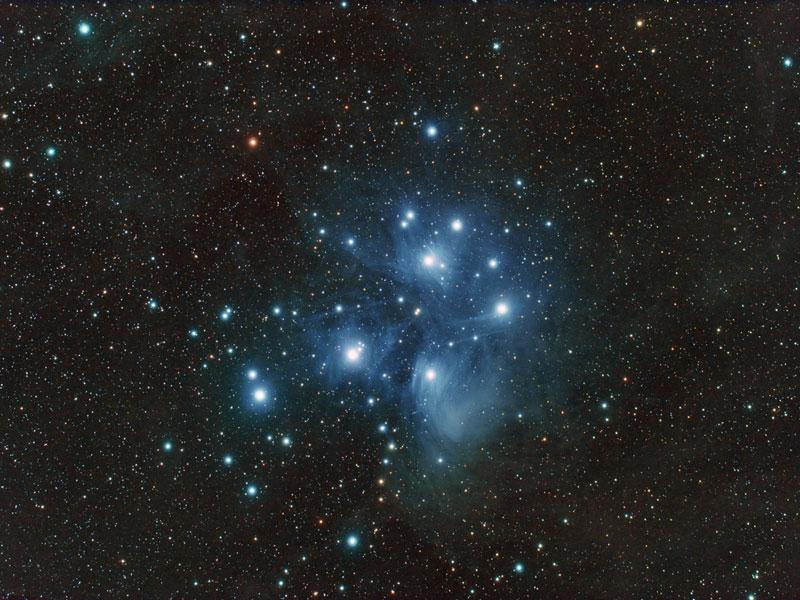 Explanation: Perhaps the most famous star cluster on the sky, the Pleiades can be seen without binoculars from even the depths of a light-polluted city. Also known as the Seven Sisters and M45, the Pleiades is one of the brightest and closest open clusters. The Pleiades contains over 3000 stars, is about 400 light years away, and only 13 light years across. Quite evident in the above photograph are the blue reflection nebulae that surround the brighter cluster stars. Low mass, faint, brown dwarfs have also been found in the Pleiades.