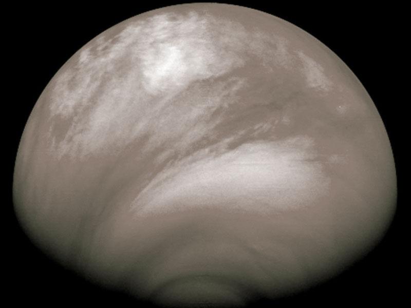 Explanation: Why did an acidic haze spread across Venus? The unusual clouds were discovered last July by ESA's robotic Venus Express spacecraft currently orbiting Venus. The bright and smooth haze was found by Venus Express to be rich in sulfuric acid, created when an unknown process lifted water vapor and sulphur dioxide from lower levels into Venus' upper atmosphere. There, sunlight broke these molecules apart and some of them recombined into the volatile sulfuric acid. Over the course of just a few days last July, the smooth acidic clouds spread from the South Pole of Venus across half the planet. The above false-color picture of Venus was taken last July 23rd in ultraviolet light, and shows the unusual haze as relatively smooth regions across the image bottom. The cause of the dark streaks in the clouds is also not yet understood and is being researched. digg_url = 'http://apod.nasa.gov/apod/ap080226.html'; digg_skin = 'compact';