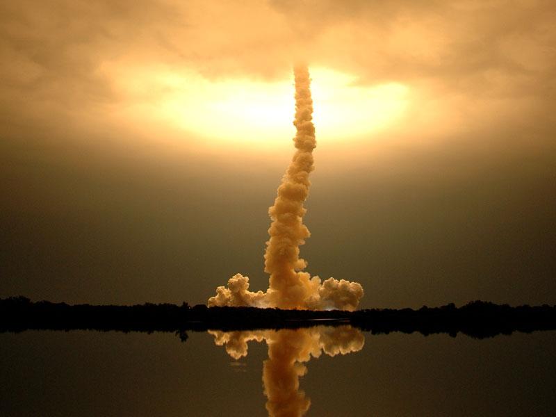 . Endeavour's rocket engines create the dramatic glow from above the clouds. From a standing start, the two million kilogram