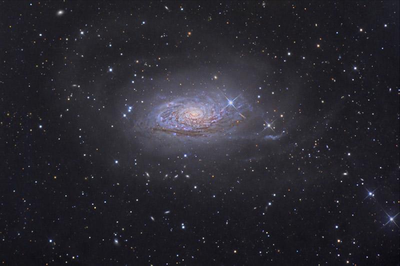 M63 sports a bright yellowish core and sweeping blue spiral arms,