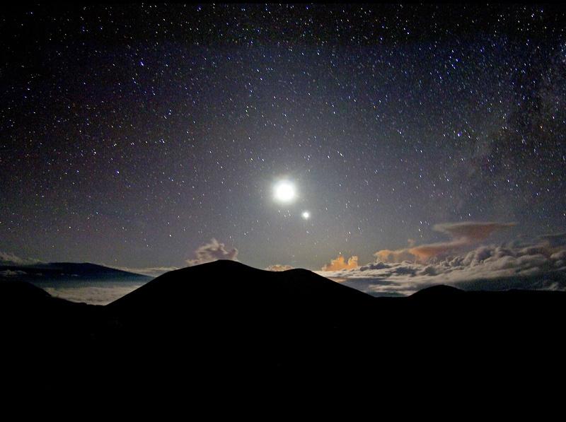 Explanation: From the windswept peak of Mauna Kea, on the Big Island of Hawaii, your view of the world at night could look like this. At an altitude of about 13,500 feet, the mountain top is silhouetted in the stunning skyscape recorded near dusk in early December of 2005. The volcanic peak rises just above a sea of storm clouds illuminated by a bright Moon. Planet Venus is setting near the Moon as the brilliant evening star. The scene also includes the faint, milky band of our own galaxy's disk of stars and cosmic dust clouds stretching from the horizon into the sky along the right edge of the frame. digg_url = 'http://apod.nasa.gov/apod/ap080423.html'; digg_skin = 'compact';