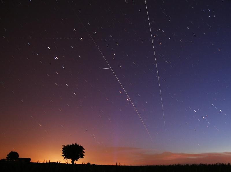 Parallax causes the paths of the ISS (right) and Discovery (near center)