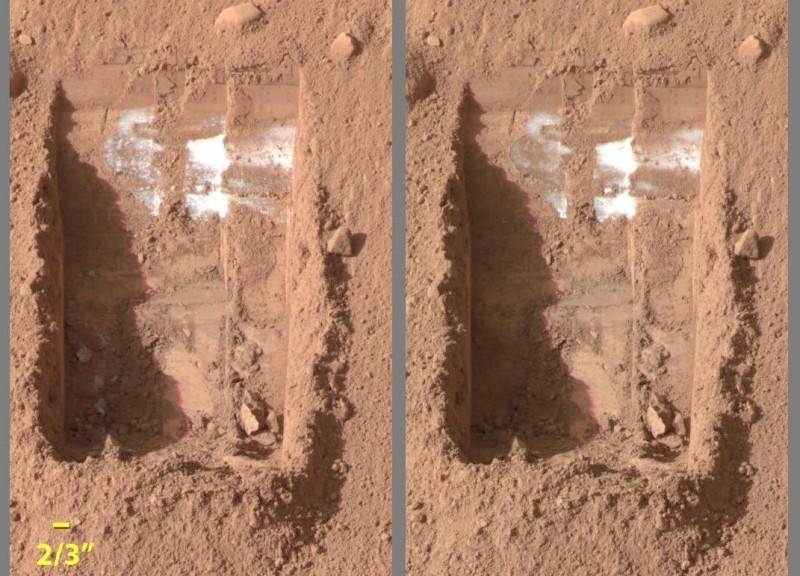 Explanation: Compare these two close-up pictures taken on sol 20 (left) and sol 24 of a trench dug in the Martian surface by NASA's Phoenix Lander. Those sols of the Phoenix Mission (a sol is a Martian day), correspond to June 15 and 18 on planet Earth. Light-colored, dice-sized chunks, visible in the lower left shadow region of the trench in the sol 20 image have vanished by sol 24 -- a strong indication that the chunks were ice uncovered by digging the shallow trench. The vanishing act likely demonstrates the sublimation of ice in the trench, a process similar to evaporation, in which the ice went directly from solid to gas after it was exposed to sunlight and the thin, dry Martian atmosphere. digg_url = 'http://apod.nasa.gov/apod/ap080621.html'; digg_skin = 'compact';