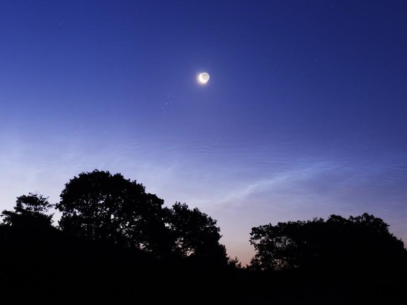 Explanation: In the early morning hours of June 30th, ghostly clouds hovered in the east in this view of near dawn skies over western France. The noctilucent or night-shining clouds lie near the edge of space, reflecting sunlight from about 80 kilometers above Earth's surface. Usually spotted above the poles in summer, they are now seen with increasing frequency farther from the poles, in this case extending to the photographer's latitude of about 48 degrees north. The trend could be a telltale sign of global changes in the atmosphere. Another 400,000 kilometers away, the Moon's sunlit crescent shines brightly, its night side illuminated by Earthshine. Of course, as a bonus for early risers June's old crescent Moon was followed closely across the sky by the lovely Pleiades star cluster, surrounded by cosmic dust clouds and shining from a mere 400 light-years away. digg_url = 'http://apod.nasa.gov/apod/ap080702.html'; digg_skin = 'compact';