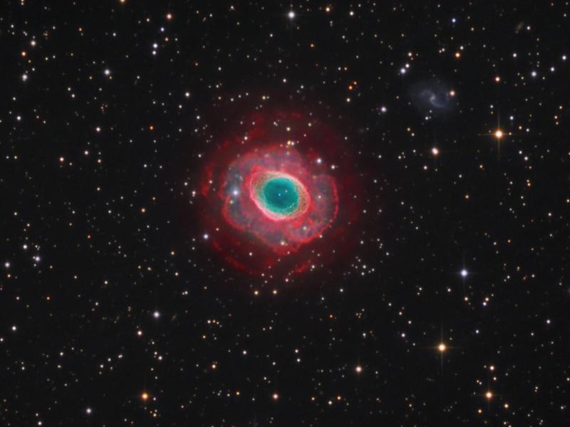 Explanation: A familiar sight for northern hemisphere astronomers, the Ring Nebula (M57) is some 2,000 light-years away in the musical constellation Lyra. The central ring is about one light-year across, but this remarkably deep exposure - a collaborative effort combining data from two different telescopes - explores the looping filaments of glowing gas extending much farther from the nebula's central star. Of course, in this well-studied example of a planetary nebula, the glowing material does not come from planets. Instead, the gaseous shroud represents outer layers expelled from a dying, sun-like star. This composite image includes over 16 hours of narrow-band data intended to record the red emission from hydrogen atoms, but the pronounced blue/green color is due to emission from oxygen atoms at higher temperatures within the ring. The much more distant spiral galaxy IC 1296 is also visible at the upper right. digg_url = 'http://apod.nasa.gov/apod/ap080918.html'; digg_skin = 'compact';