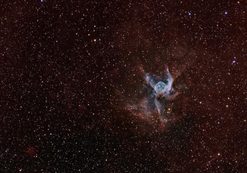 At the right, Thor's Helmet (NGC 2359) seems to gaze across