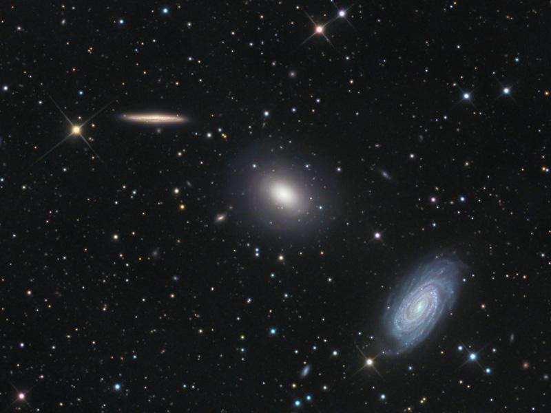Explanation: This intriguing trio of galaxies is sometimes called the Draco Group, located in the northern constellation of (you guessed it) Draco. From left to right are edge-on spiral NGC 5981, elliptical galaxy NGC 5982, and face-on spiral NGC 5985 -- all within this single telescopic field of view spanning a little more than half the width of the full moon. While the group is far too small to be a galaxy cluster and has not been cataloged compact group, these galaxies all do lie roughly 100 million light-years from planet Earth. On close examination with spectrographs, the bright core of the striking face-on spiral NGC 5985 shows prominent emission in specific wavelengths of light, prompting astronomers to classify it as a Seyfert, a type of active galaxy. Not as well known as other tight groupings of galaxies, the contrast in visual appearance makes this triplet an attractive subject for astrophotographers. This impressively deep exposure of the region also reveals faint and even more distant background galaxies. digg_url = 'http://apod.nasa.gov/apod/ap090701.html'; digg_skin = 'compact';