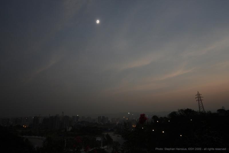 Explanation: The daytime sky grew dark, the temperature dropped, and lights came on as Chongqing, China, was plunged into the Moon's shadow during the July 22nd total solar eclipse. This serene, wide-angle view of the event looks to the east over the large, populous city from a newly constructed park. Despite thin clouds, it captures the shimmering solar corona just before the end of the eclipse total phase. This total solar eclipse occurred near Aphelion, the point in Earth's elliptical orbit farthest from the Sun, and so the Sun was near its smallest apparent size. It also occurred when the New Moon was near Perigee, the closest point to Earth in the Moon's elliptical orbit, making the Moon near its largest apparent size. The small Sun and large Moon made this the longest solar eclipse of this century. digg_url ='http://apod.nasa.gov/apod/ap090724.html'; digg_skin = 'compact';