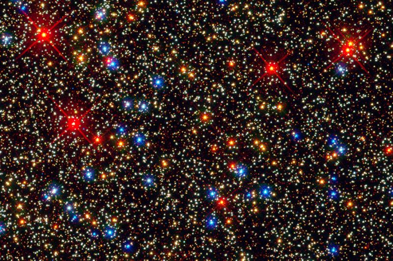 Explanation: What is left over after stars collide? To help answer this question, astronomers have been studying the center of the most massive ball of stars in our Milky Way Galaxy. In the center of globular cluster Omega Centauri, stars are packed in 10,000 times more densely than near our Sun. Pictured above, the newly upgraded Hubble Space Telescope has resolved the very center of Omega Centauri into individual stars. Visible are many faint yellow-white stars that are smaller than our Sun, several yellow-orange stars that are Red Giants, and an occasional blue star. When two stars collide they likely either combine to form one more massive star, or they stick, forming a new binary star system. Close binary stars interact, sometimes emitting ultraviolet or X-ray light when gas falls from one star onto the surface of a compact companion such as a white dwarf or neutron star. Two such binaries have now been located in Omega Centauri's center. The star cluster lies about 15,000 light-years away and is visible toward the constellation of Centaurus. digg_url = 'http://apod.nasa.gov/apod/ap090914.html'; digg_skin = 'compact';