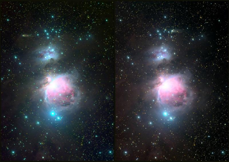 Explanation: These colorful panels both feature a familiar northern hemisphere astronomical sight: the stellar nursery known as the Great Orion Nebula. They also offer an intriguing and unfamiliar detail of the nebula rich skyscape -- a passing comet. Recorded this weekend with a remotely operated telescope in New Mexico, the right hand image was taken on September 26 and the left on September 27. Comet 217P Linear sports an extended greenish tail and lies above the bluish Running Man reflection nebula near the top of both frames. Nearby and moving rapidly through the night sky, the comet's position clearly shifts against the cosmic nebulae and background stars from one night to the next. In fact, the comet was a mere 5 light-minutes away on September 27, compared to 1,500 light-years for the Orion Nebula. Much too faint to be seen with the unaided eye, Comet 217P Linear is a small periodic comet with an orbital period of about 8 years. At its most distant point from the Sun, the comet's orbit is calculated to reach beyond the orbit of Jupiter At its closest point to the Sun, the comet still lies just beyond the orbit of planet Earth. digg_url ='http://apod.nasa.gov/apod/ap091002.html'; digg_skin = 'compact';