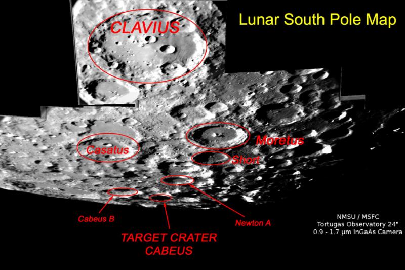 Explanation: About 100 kilometers from the Moon's South Pole, 100 kilometer wide crater Cabeus is the target for two LCROSS mission spacecraft on course to impact the Moon tomorrow. The shadowed crater is strongly foreshortened in this mosaic, a representative view of the region for earthbound telescopes. The impacts are intended to create billowing debris plumes extending into the sunlight above the crater walls, that could reveal signs of water. First to impact will be the mission's Centaur upper stage rocket at 11:30 UT (7:30am EDT). The instrumented LCROSS mothership will image the impact and then fly through the resulting debris plume analyzing the material blasted from the crater floor. Four minutes after the first impact, the LCROSS mothership itself will crash into Cabeus. The plumes are expected to be visible in telescopes about 10 inches in diameter or larger, with the timing favoring Moon watchers in western North America and the Pacific. NASA also plans to broadcast live footage from the LCROSS mission on NASA TV starting at 6:15am EDT / 3:15am PDT on October 9. digg_url ='http://apod.nasa.gov/apod/ap091008.html'; digg_skin = 'compact';