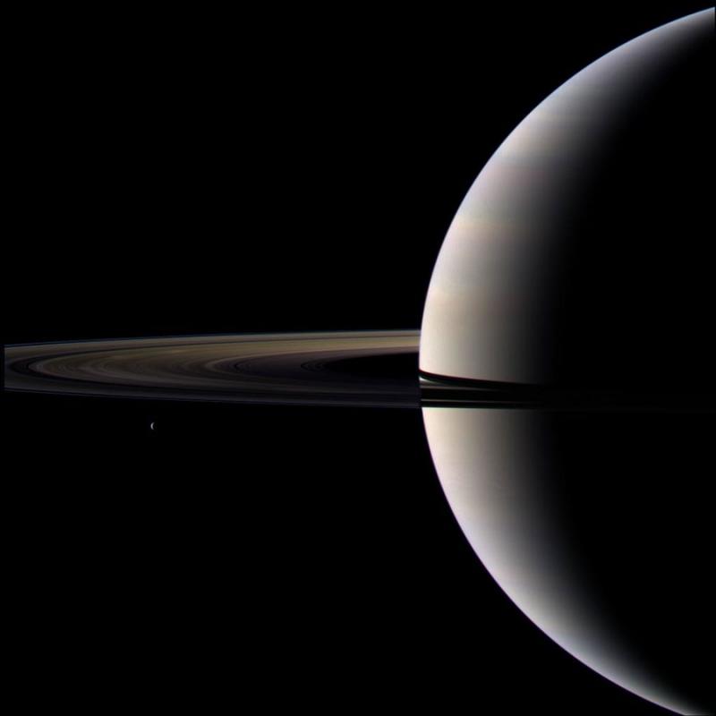 Imaged from nearly behind, Saturn and its moon