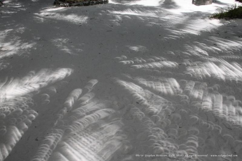 Explanation: Eclipses are everywhere in this shady scene. The picture was taken on the Indian Ocean atoll island of Ellaidhoo, Maldives, on January 15, during the longest annular solar eclipse for the next 1,000 years. Tall palm trees provided the shade. Their many crossed leaves created gaps that acted like pinhole cameras, scattering recognizable eclipse images across the white sands of a tropical garden near the beach. From this idyllic location near the centerline of the Moon's shadow track, the ring of fire or annular phase of the eclipse lasted about 10 minutes and 55 seconds. digg_url = 'http://apod.nasa.gov/apod/ap100123.html'; digg_skin = 'compact';