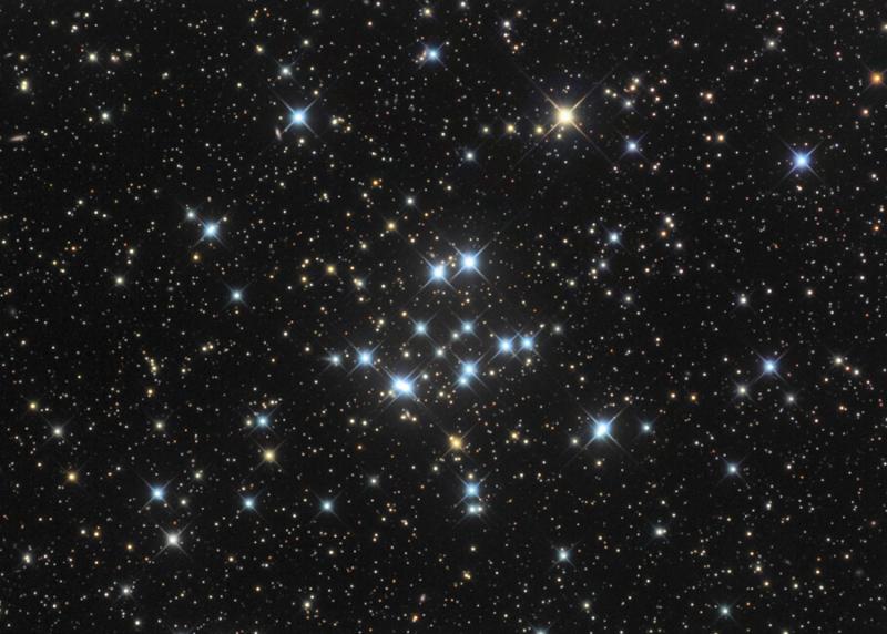 Explanation: This pretty open cluster of stars, M34, is about the size of the Full Moon on the sky. Easy to appreciate in small telescopes, it lies some 1,800 light-years away in the constellation Perseus. At that distance, M34 physically spans about 15 light-years. Formed at the same time from the same cloud of dust and gas, all the stars of M34 are about 200 million years young. But like any open star cluster orbiting in the plane of our galaxy, M34 will eventually disperse as it experiences gravitational tides and encounters with the Milky Way's interstellar clouds and other stars. Over four billion years ago, our own Sun was likely formed in a similar open star cluster. digg_url = 'http://apod.nasa.gov/apod/ap100211.html'; digg_skin = 'compact';