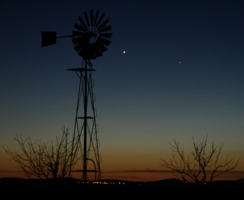 Explanation: In this twilight skyview, a windmill stands in silent witness to a lovely pairing of planets in the west. The picture was recorded on April 5 from Gallegos del Campo, Zamora, Spain. Venus (left) and Mercury (right) are near their much anticipated conjunction in the early evening sky. But even in the coming days, these two evening stars will remain close in the western sky at sunset. In fact, with brighter Venus as a marker, sky watchers will have an excellent guide for spotting Mercury nearby, a planet often hidden in the Sun's glare.