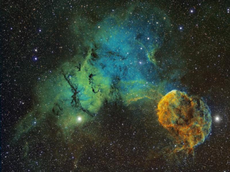 Explanation: Normally faint and elusive, the Jellyfish Nebula is caught in this alluring, false-color, telescopic view. Flanked by two bright stars, Mu and Eta Geminorum, at the foot of a celestial twin, the Jellyfish Nebula is the brighter arcing ridge of emission with dangling tentacles below and right of center. In fact, the cosmic jellyfish is seen to be part of bubble-shaped supernova remnant IC 443, the expanding debris cloud from a massive star that exploded. Light from the explosion first reached planet Earth over 30,000 years ago. Like its cousin in astrophysical waters the Crab Nebula supernova remnant, IC 443 is known to harbor a neutron star, the remnant of the collapsed stellar core. Emission nebula Sharpless 249 fills the field at the upper left. The Jellyfish Nebula is about 5,000 light-years away. At that distance, this image would be about 300 light-years across. The color scheme used in the narrowband composite was made popular in Hubble Space Telescope images, mapping emission from oxygen, hydrogen, and sulfur atoms to blue, green and red colors.