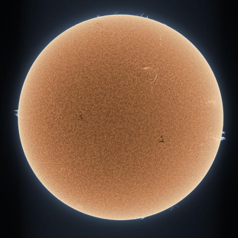 are visible, while two prominences on the Sun's face are seen as light streaks just above and right of the image center. Two particularly