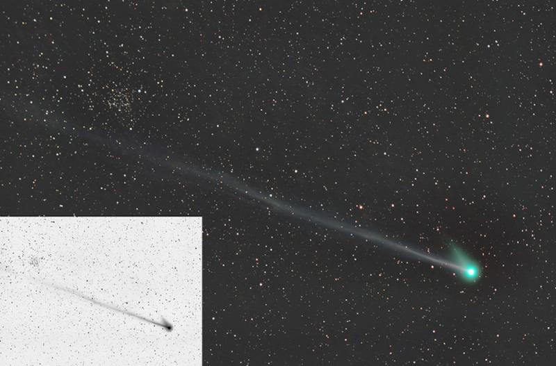 Explanation: Of the many comets named for discoverer Robert McNaught, the one cataloged as C/2009 R1 is gracing dawn skies for northern hemisphere observers this month. Seen here on June 13th from southern New Mexico, this Comet McNaught's long ion tail sweeps across the telescopic field of view (a negative image is inset). Remarkably, the ion tail easily stretches past background star cluster NGC 1245 (upper left) in the constellation Perseus, about 1.5 degrees from the comet's lovely greenish head or coma. The coma also sports a short, stubby, dust tail. Of course, the comet and background stars move at different rates through planet Earth's skies. But a digital processing of many short exposures allowed frames of comet and stars to be separated, registered, and recombined in the final image. To see the comet separate from the background stars, just slide your cursor over the image. The recombined frames show off both the rich star field and faint details of the comet. Easy to spot in binoculars for now, McNaught will sink into the twilight along the eastern horizon in the coming days as it heads toward perihelion (closest approach to the Sun) on July 2. Poll: Which of last week's APODs should be the APOW?