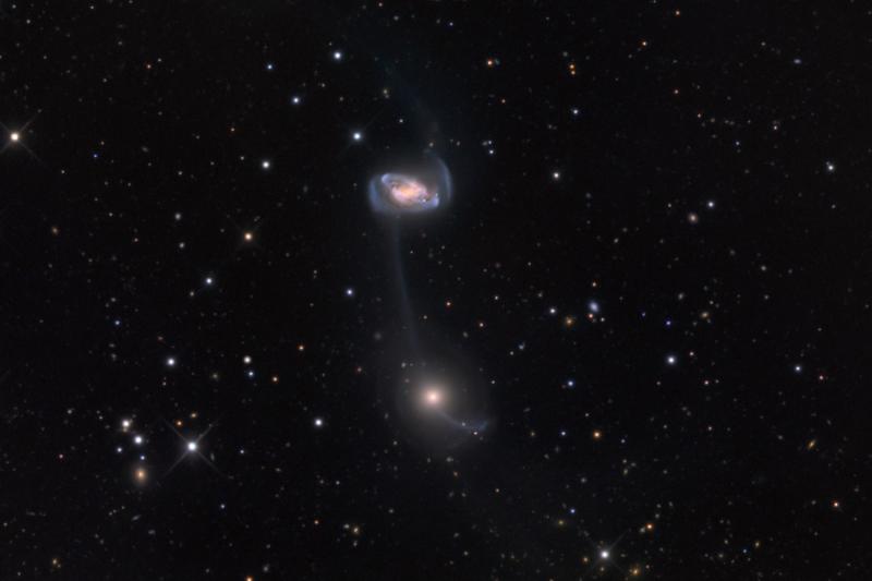 Explanation: Galaxies NGC 5216 (top) and NGC 5218 really do look like they are connected by a string. Of course, that string is a cosmic trail of gas, dust, and stars about 22,000 light-years long. Also known as Keenan's system (for its discoverer) and Arp 104, the interacting galaxy pair is some 17 million light-years away in the constellation Ursa Major. The debris trail that joins them, along with NGC 5218's comma-shaped extension and the distorted arms of NGC 5216, are a consequence of mutual gravitational tides. The tides disrupt the galaxies as they repeatedly swing close to one another. Drawn out over billions of years, the encounters will likely result in their merger into a single galaxy of stars. Such spectacular galactic mergers are now understood to be a normal part of the evolution of galaxies, including our own Milky Way. Ponder: Can you guess the result of this simple experiment?