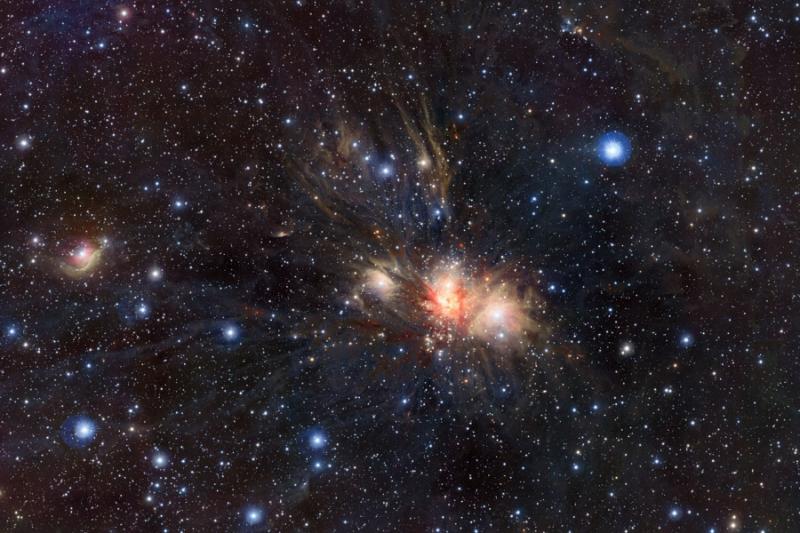 Explanation: Drifting through the one-horned constellation Monoceros, these dusty streamers and new born stars are part of the active Monoceros R2 star-forming region, embedded in a giant molecular cloud. The cosmic scene was recorded by the VISTA survey telescope in near-infrared light. Visible light images show dusty NGC 2170, seen here just right of center, as a complex of bluish reflection nebulae. But this penetrating near-infrared view reveals telltale signs of ongoing star formation and massive young stars otherwise hidden by the dust. Energetic winds and radiation from the hot young stars reshape the natal interstellar clouds. Close on the sky to the star-forming Orion Nebula, the Monoceros R2 region is almost twice as far away, about 2700 light-years distant. At that distance, this vista spans about 80 light-years. Poll: Which APOD would you select for last month's APOM?
