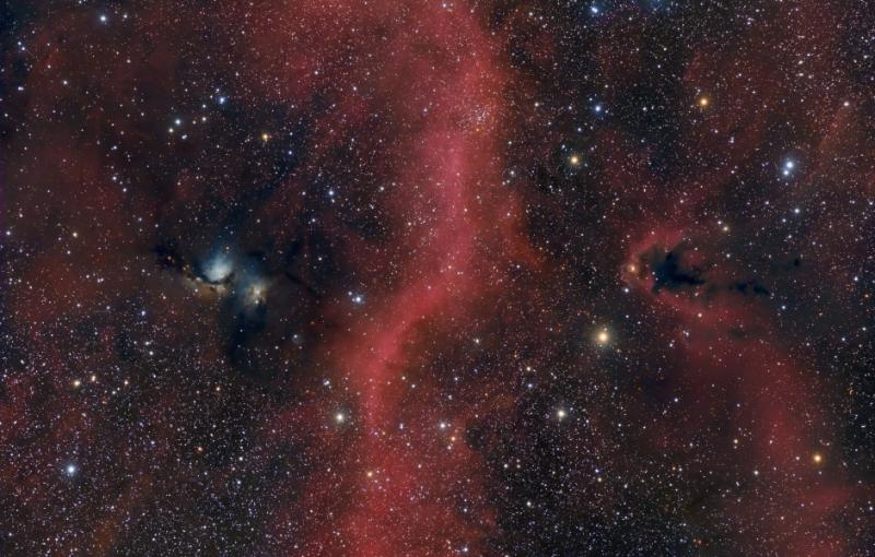 Explanation: Bright stars, clouds of dust and glowing nebulae decorate this cosmic scene, a skyscape just north of Orion's belt. Close to the plane of our Milky Way Galaxy, the wide field view spans about 5.5 degrees. Striking bluish M78, a reflection nebula, is at the left. M78's tint is due to dust preferentially reflecting the blue light of hot, young stars. In colorful contrast, the red sash of glowing hydrogen gas sweeping through the center is part of the region's faint but extensive emission nebula known as Barnard's Loop. At right, a dark dust cloud forms a prominent silhouette cataloged as LDN 1622. While M78 and the complex Barnard's Loop are some 1,500 light-years away, LDN 1622 is likely to be much closer, only about 500 light-years distant from our fair planet Earth.