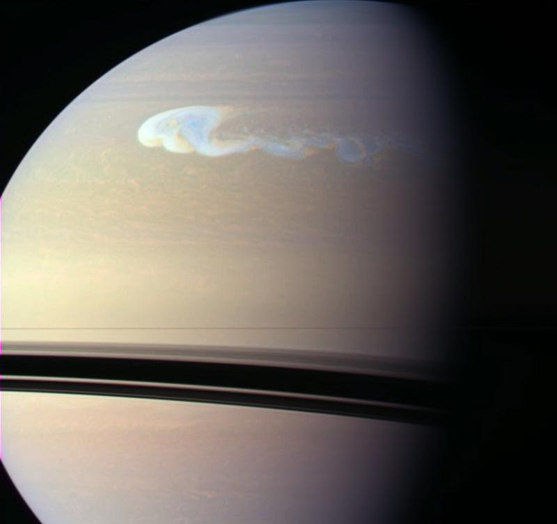 Explanation: Late last year, a new, remarkably bright storm erupted in Saturn's northern hemisphere. Amateur astronomers first spotted it in early December, with the ringed gas giant rising in planet Earth's predawn sky. Orbiting Saturn, the Cassini spacecraft was able to record this close-up of the complex disturbance from a distance of 1.8 million kilometers on December 24th. Over time, the storm has evolved, spreading substantially in longitude, and now stretches far around the planet. Saturn's thin rings are also seen slicing across this space-based view, casting broad shadows on the planet's southern hemisphere. Students: Free astronomy lectures in the discussion forum