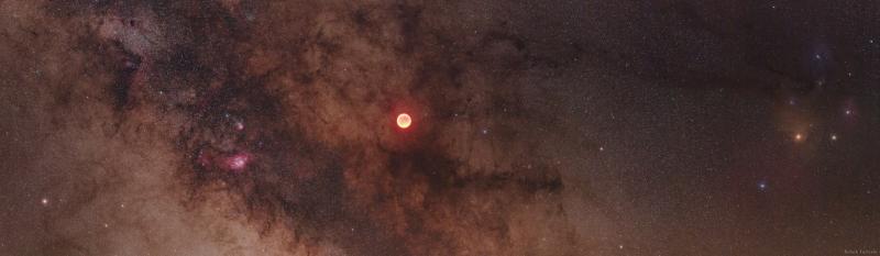 Explanation: On June 15, the totally eclipsed Moon was very dark, with the Moon itself positioned on the sky toward the center of our Milky Way Galaxy. This simple panorama captures totality from northern Iran in 8 consecutive exposures each 40 seconds long. In the evocative scene, the dark of the eclipsed Moon competes with the Milky Way's faint glow. The tantalizing red lunar disk lies just above the bowl of the dark Pipe Nebula, to the right of the glowing Lagoon and Trifid nebulae and the central Milky Way dust clouds. At the far right, the wide field is anchored by yellow Antares and the colorful clouds of Rho Ophiuchi. To identify other sights of the central Milky Way just slide your cursor over the image. The total phase of this first lunar eclipse of 2011 lasted an impressive 100 minutes. Parts of the eclipse were visible from most of planet Earth, with notable exceptions of North and Central America.
