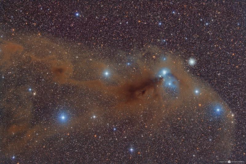 Explanation: Cosmic dust clouds sprawl across a rich field of stars in this sweeping telescopic vista near the northern boundary of Corona Australis, the Southern Crown. Probably less than 500 light-years away and effectively blocking light from more distant, background stars in the Milky Way, the densest part of the dust cloud is about 8 light-years long. At its tip (upper right) is a group of lovely reflection nebulae cataloged as NGC 6726, 6727, 6729, and IC 4812. A characteristic blue color is produced as light from hot stars is reflected by the cosmic dust. The smaller yellowish nebula (NGC 6729) surrounds young variable star R Coronae Australis. Magnificent globular star cluster NGC 6723 is toward the upper right corner of the view. While NGC 6723 appears to be part of the group, it actually lies nearly 30,000 light-years away, far beyond the Corona Australis dust clouds.