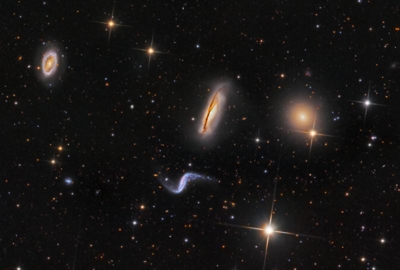 in the center of the image are edge-on NGC 3190 with its distinctive,