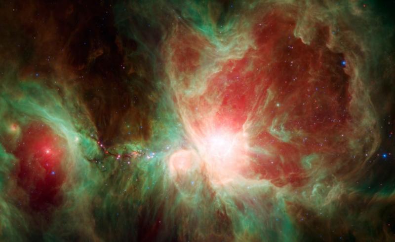the nebula is likewise centered on Orion's young, massive, hot stars,
