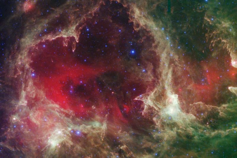 Explanation: How do stars form? A study of star forming region W5 by the sun-orbiting Spitzer Space Telescope provides clear clues by recording that massive stars near the center of empty cavities are older than stars near the edges. A likely reason for this is that the older stars in the center are actually triggering the formation of the younger edge stars. The triggered star formation occurs when hot outflowing gas compresses cooler gas into knots dense enough to gravitationally contract into stars. Spectacular pillars, left slowly evaporating from the hot outflowing gas, provide further visual clues. In the above scientifically-colored infrared image, red indicates heated dust, while white and green indicate particularly dense gas clouds. W5 is also known as IC 1848, and together with IC 1805 form a complex region of star formation popularly dubbed the Heart and Soul Nebulas. The above image highlights a part of W5 spanning about 2,000 light years that is rich in star forming pillars. W5 lies about 6,500 light years away toward the constellation of Cassiopeia.