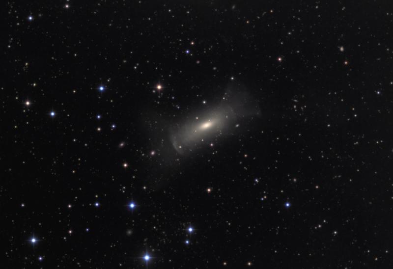 Explanation: Similar in size to the Milky Way, elliptical galaxy NGC 7600 is about 160 million light-years distant. In this deep image, spanning about 1/2 degree on the sky toward the constellation Aquarius, NGC 7600 sports a remarkable outer halo of nested shells and broad circumgalactic structures. The tantalizing features can be explained by the accretion of dark matter and stars on a cosmic timescale. In fact, a movie generated by simulating galaxy formation using a cosmological model with cold dark matter for the halos of merging galaxies reproduces the appearance of NGC 7600 in amazing detail. The remarkable simulation movie is available here on Vimeo and here in other formats. It presents compelling evidence that detailed features of galaxy mergers observed with small, wide field telescopes on planet Earth, are natural consequences of galaxy formation and fundamental properties of dark matter. Browse or share: Latest Comet Lovejoy pictures
