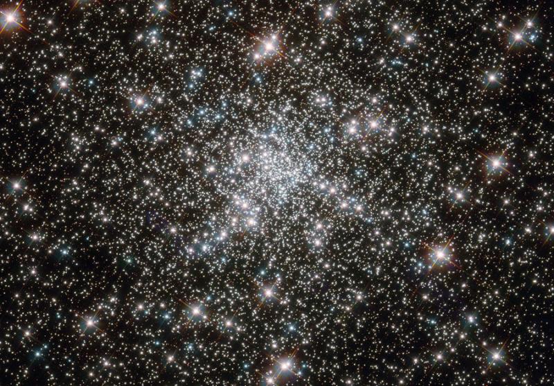 Explanation: This sharp Hubble Space Telescope view looks deep into NGC 6752. Some 13,000 light-years away toward the southern constellation Pavo, the globular star cluster roams the halo of our Milky Way galaxy. Over 10 billion years old, NGC 6752 holds over 100 thousand stars in a sphere about 100 light-years in diameter, but the Hubble image frame spans the central 10 or so light-years and resolves stars near the dense cluster core. In fact the frame includes some of the cluster's blue straggler stars, stars which appear to be too young and massive to exist in a cluster whose stars are all expected to be at least twice as old as the Sun. Explorations of the NGC 6752 have also indicated that a remarkable fraction of the stars near the cluster's core, are multiple star systems, supporting arguments that star mergers and collisions in the dense stellar environment can create the cluster's blue straggler stars.