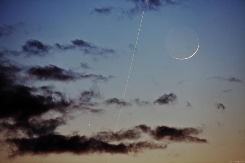 Explanation: Planet Earth has many moons. Its largest artifical moon, the International Space Station, streaks through this lovely skyview with clouds in silhouette against the fading light of a sunset. Captured from Stuttgart, Germany last Sunday, the frame also includes Earth's largest natural satellite 1.5 days after its New Moon phase. Just below and left of the young crescent is Jupiter, another bright celestial beacon hovering near the western horizon in early evening skies. Only briefly, as seen from the photographer's location, Jupiter and these moons of Earth formed the remarkably close triple conjunction. Of course, Jupiter has many moons too. In fact, close inspection of the photo will reveal tiny pin pricks of light near the bright planet, large natural satellites of Jupiter known as Galilean moons.