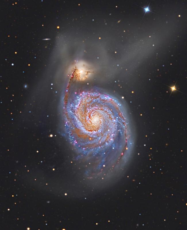 Explanation: Follow the handle of the Big Dipper away from the dipper's bowl until you get to the handle's last bright star. Then, just slide your telescope a little south and west and you might find this stunning pair of interacting galaxies, the 51st entry in Charles Messier famous catalog. Perhaps the original spiral nebula, the large galaxy with well defined spiral structure is also cataloged as NGC 5194. Its spiral arms and dust lanes clearly sweep in front of its companion galaxy (top), NGC 5195. The pair are about 31 million light-years distant and officially lie within the angular boundaries of the small constellation Canes Venatici. Though M51 looks faint and fuzzy to the human eye, deep images like this one can reveal the faint tidal debris around the smaller galaxy.