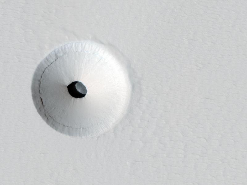 Explanation: What created this unusual hole in Mars? The hole was discovered by chance on images of the dusty slopes of Mars' Pavonis Mons volcano taken by the HiRISE instrument aboard the robotic Mars Reconnaissance Orbiter currently circling Mars. The hole appears to be an opening to an underground cavern, partly illuminated on the image right. Analysis of this and follow-up images revealed the opening to be about 35 meters across, while the interior shadow angle indicates that the underlying cavern is roughly 20 meters deep. Why there is a circular crater surrounding this hole remains a topic of speculation, as is the full extent of the underlying cavern. Holes such as this are of particular interest because their interior caves are relatively protected from the harsh surface of Mars, making them relatively good candidates to contain Martian life. These pits are therefore prime targets for possible future spacecraft, robots, and even human interplanetary explorers. ASOW: From the Big Bang to the Nobel Prize and the End of the Universe by John C. Mather