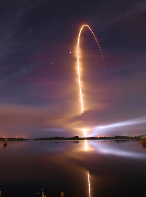 Explanation: This graceful arc traces a Delta rocket climbing through Thursday's early morning skies over Cape Canaveral Air Force Station in Florida, USA. Snug inside the rocket's Centaur upper stage were NASA's twin Radiation Belt Storm Probes (RBSP), now in separate orbits within planet Earth's Van Allen radiation belts. Reflected in the Turn Basin from a vantage point about 3 miles from Space Launch Complex 41, the scene was captured in a composite of two exposures. One highlights the dramatic play of launch pad lighting, clouds, and sky. A subsequent 3 minute long exposure records the rocket's fiery trail. While most spacecraft try to avoid the radiation belts, named for their discoverer James Van Allen, RBSP's mission will be to explore their dynamic and harsh conditions.
