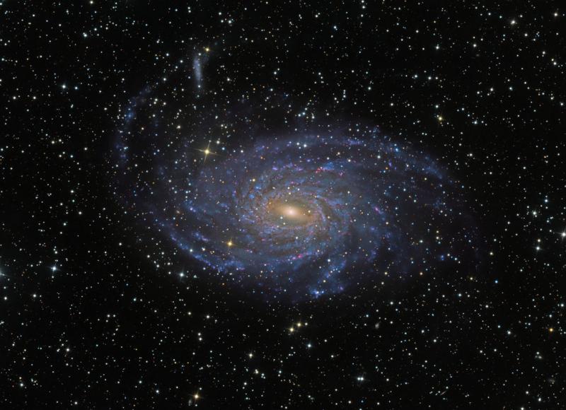 Beautiful spiral galaxy NGC 6744 is nearly 175,000 light-years across, larger than our own Milky Way. It lies some 30 million light-years distant in the southern constellation Pavo and appears as only a faint, extended object in small telescopes. We see the disk of the nearby island universe tilted towards our line of sight. This remarkably detailed galaxy portrait covers an area about the angular size of the full moon. In it, the giant galaxy's elongated yellowish core is dominated by the light from old, cool stars. Beyond the core, grand spiral arms are filled with young blue star clusters and speckled with pinkish star forming regions. An extended arm sweeps past a smaller satellite galaxy at the upper left. NGC 6744's galactic companion is reminiscent of the Milky Way's satellite galaxy the Large Magellanic Cloud. This Weekend: Meteor Showers Expected, Moon bites Sun (again)