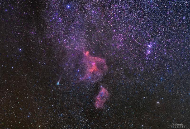 The greenish coma of comet 21P/Giacobini-Zinner stands out at the left of this telephoto skyscape spanning over 10 degrees toward the northern constellations Cassiopeia and Perseus. Captured on August 17, the periodic comet is the known parent body of the upcoming Draconid meteor shower. Predicted to be at its brightest next month, the comet is actually in the foreground of the rich starfield, only about 4 light-minutes from our fair planet. Giacobini-Zinner should remain too faint for your eye to see though, like the colorful Heart and Soul nebulae near the center of the sensitive digital camera's field of view. But the pair of open star clusters at the right, h and Chi Persei, could just be seen by the unaided eye from dark locations. The Heart and Soul nebulae with their own embedded clusters of young stars a million or so years old, are each over 200 light-years across and 6 to 7 thousand light-years away. They are part of a large, active star forming complex sprawling along the Perseus spiral arm of our Milky Way Galaxy. Also known as the Double Cluster, h and Chi Perse