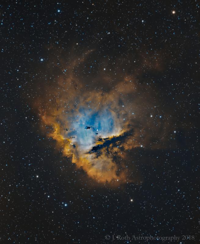 Look through the cosmic cloud cataloged as NGC 281 and you might miss the stars of open cluster IC 1590. Still, formed within the nebula that cluster's young, massive stars ultimately power the pervasive nebular glow. The eye-catching shapes looming in this portrait of NGC 281 are sculpted dusty columns and dense Bok globules seen in silhouette, eroded by intense, energetic winds and radiation from the hot cluster stars. If they survive long enough, the dusty structures could also be sites of future star formation. Playfully called the Pacman Nebula because of its overall shape, NGC 281 is about 10,000 light-years away in the constellation Cassiopeia. This sharp composite image was made through narrow-band filters. It combines emission from the nebula's hydrogen and oxygen atoms to synthesize red, green, and blue colors. The scene spans well over 80 light-years at the estimated distance of NGC 281.