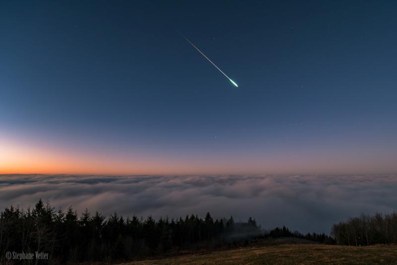 On November 17, just an hour before sunrise, this bright and colorful meteor flashed through clear predawn skies. Above a sea of clouds this striking autumn morning's moment was captured from Hochblauen, a prominent 1165 meter high summit in southern Germany's Black Forest. Shining through the twilight, Sirius as well as the familiar stars of Orion are recognizable near the southwestern horizon, and the meteor seems headed right for the hunter's belt and sword. Still, as part of the annual Leonid meteor shower, the meteor trail does point back to the shower's radiant. The constellation Leo is high above the horizon and off the top left of the frame.