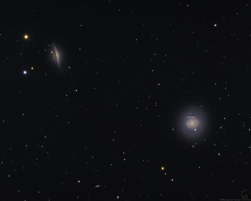 Large spiral galaxy NGC 1055 at top left joins spiral Messier 77 (bottom right) in this cosmic view toward the aquatic constellation Cetus. The narrowed, dusty appearance of edge-on spiral NGC 1055 contrasts nicely with the face-on view of M77's bright nucleus and spiral arms. Both over 100,000 light-years across, the pair are dominant members of a small galaxy group about 60 million light-years away. At that estimated distance, M77 is one of the most remote objects in Charles Messier's catalog, and is separated from fellow island universe NGC 1055 by at least 500,000 light-years. The field of view is about the size of the full Moon on the sky and includes colorful foreground Milky Way stars along with more distant background galaxies. Taken on November 28, the sharp image also includes newly discovered supernova SN2018ivc, its location indicated in the arms of M77. The light from the explosion of one of M77's massive stars was discovered by telescopes on planet Earth only a few days earlier on November 24.