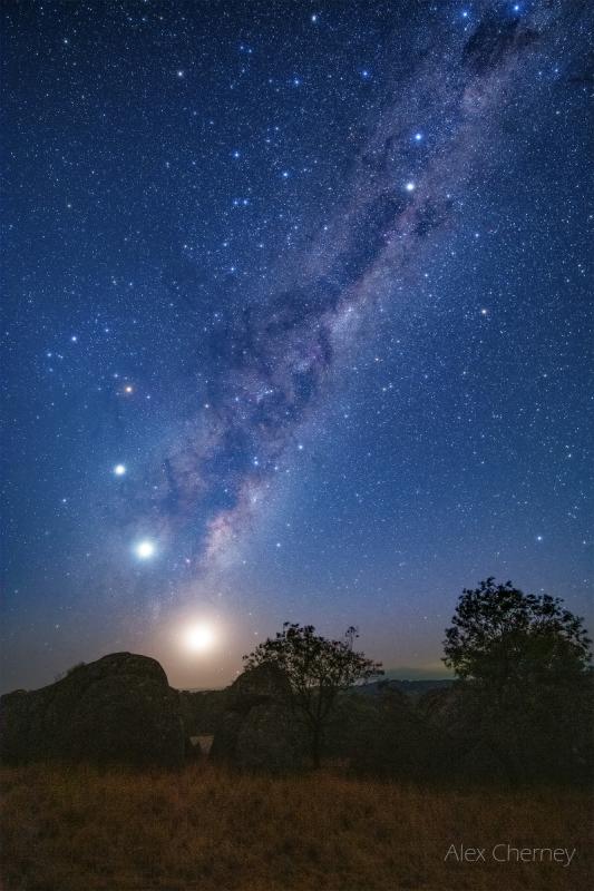 A luminous Milky Way falls toward the horizon in this deep skyscape, starting at the top of the frame from the stars of the Southern Cross and the dark Coalsack Nebula. Captured in the dark predawn of February 2nd from Central Victoria, Australia, planet Earth, the 26 day old waning crescent Moon still shines brightly near the horizon. The second and third brightest celestial beacons are Venus and Jupiter along the lower part of the Milky Way's central bulge. Almost in line with the brighter planets and Moon, Saturn is the pinprick of light just visible below and right of the lunar glow. Australia's first astronomers saw the elongated, bulging shape of the familiar Milky Way as a great celestial Emu. The Moon and planets could almost be the Emu's eggs on this starry night.