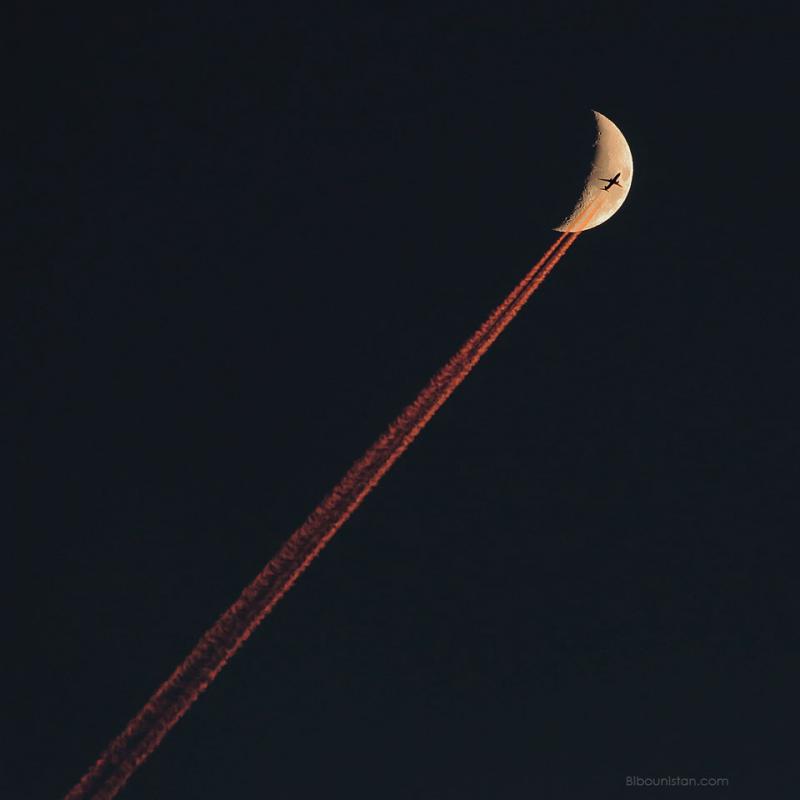 No, this is not a good way to get to the Moon. What is pictured is a chance superposition of an airplane and the Moon. The contrail would normally appear white, but the large volume of air toward the setting Sun preferentially knocks away blue light, giving the reflected trail a bright red hue. Far in the distance, well behind the plane, is a crescent Moon, also slightly reddened. Captured a month ago above Valais, Switzerland, the featured image was taken so soon after sunset that planes in the sky were still in sunlight, as were their contrails. Within minutes, unfortunately, the impromptu sky show ended. The plane crossed the Moon and moved out of sight. The Moon set. The contrail became unilluminated and then dispersed.