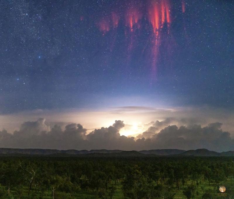 What are those red filaments in the sky? It is a rarely seen form of lightning confirmed only about 30 years ago: red sprites. Recent research has shown that following a powerful positive cloud-to-ground lightning strike, red sprites may start as 100-meter balls of ionized air that shoot down from about 80-km high at 10 percent the speed of light and are quickly followed by a group of upward streaking ionized balls. The featured image, taken just over a week ago in Kununurra, Western Australia, captured some red sprites while shooting a time-lapse sequence of a distant lightning storm. Pictured, green trees cover the foreground, dark mountains are seen on the horizon, ominous storm clouds hover over the distant land, while red sprites appear in front of stars far in the distance. Red sprites take only a fraction of a second to occur and are best seen when powerful thunderstorms are visible from the side.